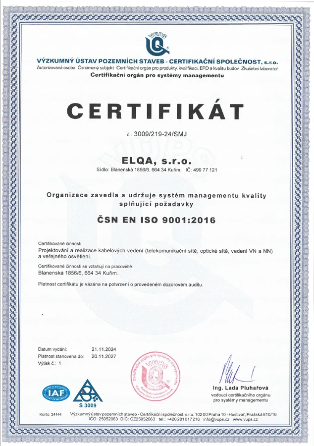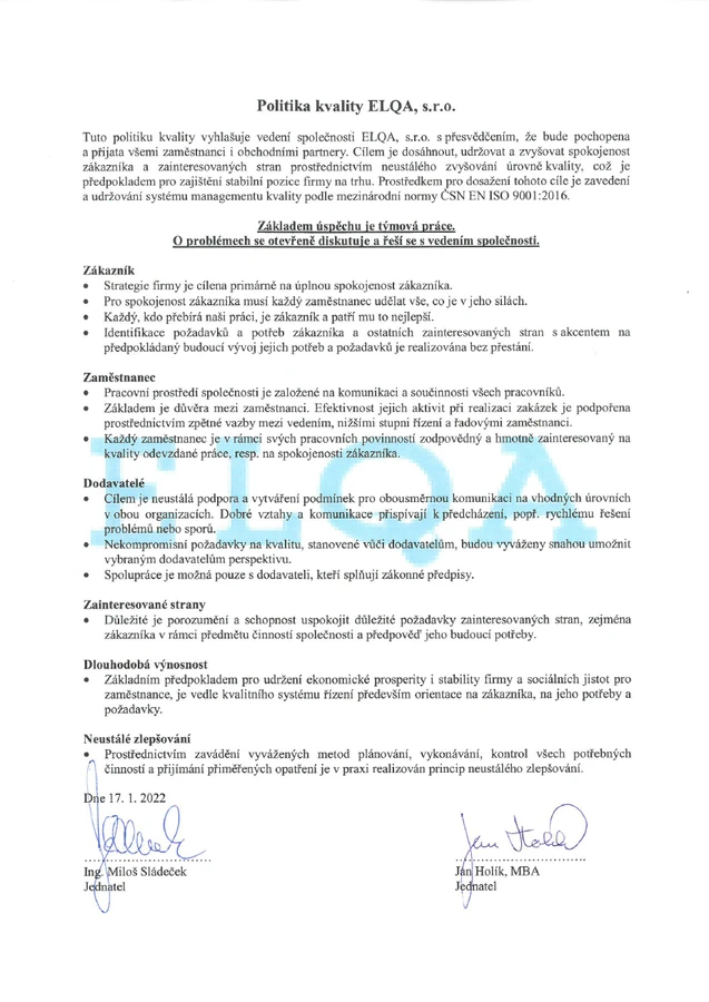 ELQA s.r.o. má zaveden a certifikován systém managementu kvality dle normy ISO 9001.
